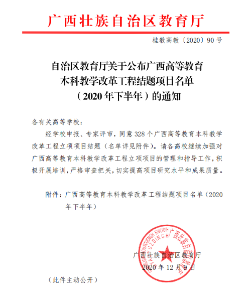 自治区教育厅关于公布广西高等教育本科教学改革研究项目2020年度下半年结题情况的通知