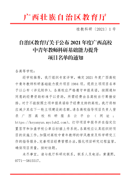 自治区教育厅关于公布2021年度广西高校中青年教师科研基础能力提升项目名单的通知