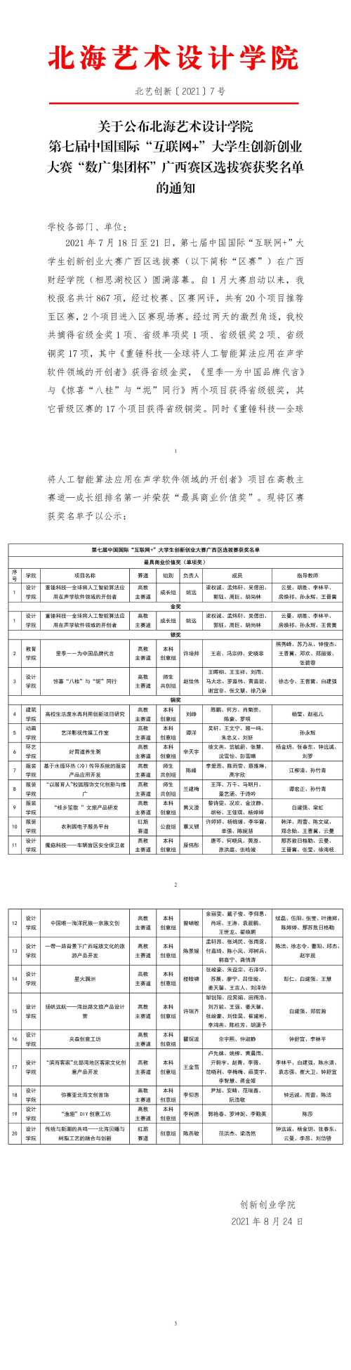 北艺创新〔2021〕7号关于公布北海艺术设计学院第七届中国国际“互联网+”大学生创新创业大赛“数广集团杯”广西赛区选拔赛获奖名单的通知