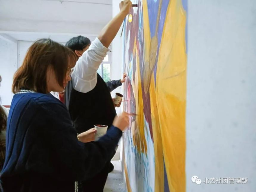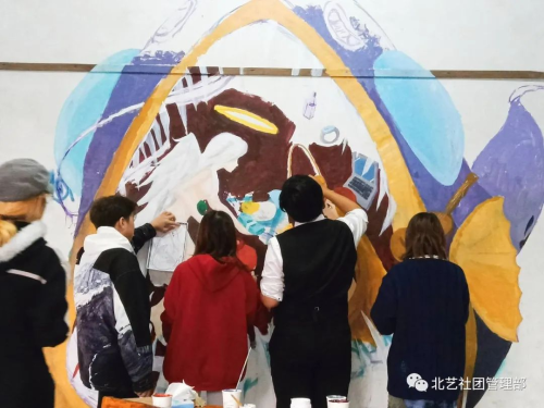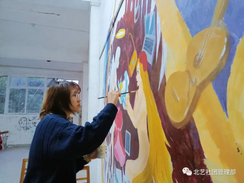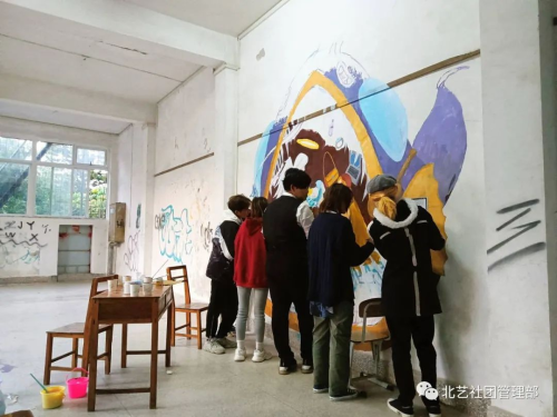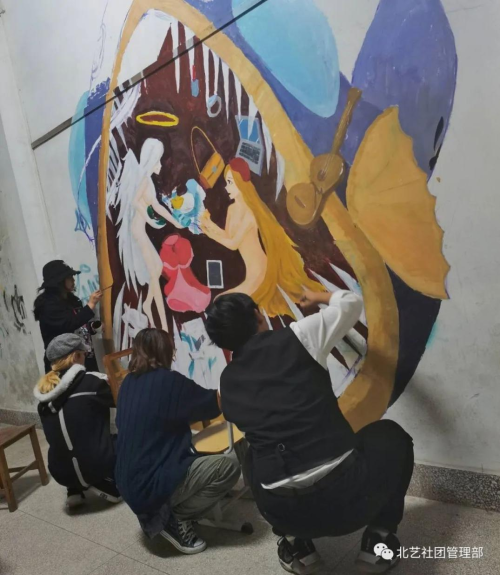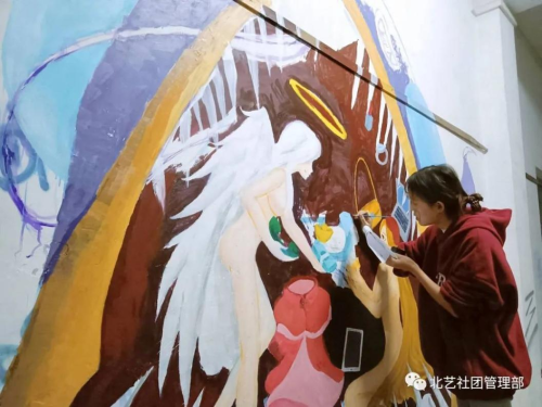 学校手绘社在形体楼2楼墙上留下了一幅美丽的作品。