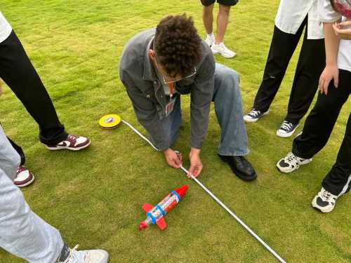 首先进行的是限时八分钟的水火箭组装赛。面对兼具挑战性和趣味性的组装考验,各个小组都能从容不迫地应对。在经过紧张的组装环节,一个个水火箭有了雏形,每个小组水火箭都被装饰得形式各异、精致美观,充分体现了各个小组的个性与追求。