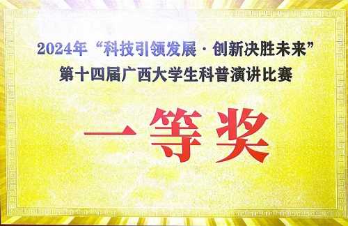 近日,第十四届广西大学生科普演讲比赛(决赛)在广西图书馆圆满落幕。我校师生在此次比赛中表现优异,其中我校教师张丽君荣获大赛指导老师奖,我校学子林怡蓉荣获决赛一等奖!