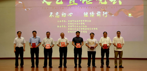 出席本次晚会的领导嘉宾有:北海市社会科学界联合会党组书记,主席伍朝胜;市社科联党组成员,副主席李文红;市社科联科研室科长,宁霞;原北海市政府经济研究中心主任李玉华;原北海市教育科学研究所办公室主任,现任中央民族大学附中北海国际学校校长办公室综合主管刘成学;原合浦县政府办副主任科员现挂任合浦县社科联副主席范翔宇;北海市住房公积金管理中心归集管理科科长谭伟强;北海市心理咨询师协会会长开治中;北海市艺术设计协会秘书长,李敬义;北海艺术设计学院环境艺术学院副院长王明森;北海艺术设计学院美术学院副院长唐海;北海艺术设计学院环境艺术学院副院长王文刚。本次晚会由史昕桐老师主持。