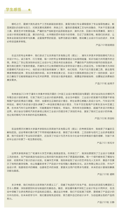 为深化学生对产品设计行业的理解,进一步拓宽其专业视野,全面提升实践能力与创新能力,近日,北京实践基地负责人严腾、设计艺术学院副院长邓渠成、产品设计教研室副主任钟远诚带队,组织产品设计专业2021级学生在京前往北京奔驰汽车有限公司、清华大学美术学院和哪吒汽车北京设计中心开展专业考察活动。