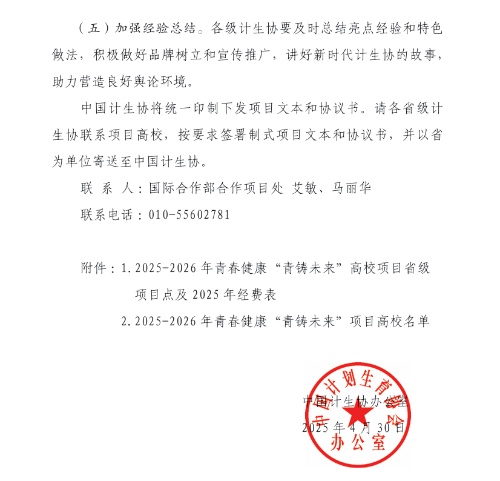 近日,中国计划生育协会印发《关于确定2025年—2026年青春健康“青铸未来”高校项目点的通知》,公布了2025年—2026年青春健康高校项目的评审结果,我校“共筑青春健康,‘艺’起走向未来”项目在全国600余份立项申请书中脱颖而出,获批立项并获得连续两年度的经费资助。