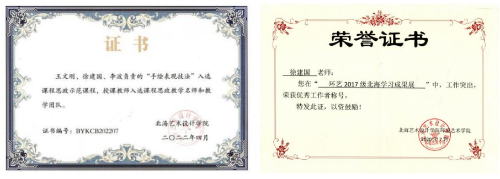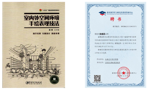 专注学科建设,聚焦环境艺术设计,徐建国老师积极开展教学实践与理论研究。2019年,参与出版了教材《室内外空间环境手绘表现技法》;2022年,参与完成了校级本科专业《手绘表现技法》核心课程建设项目申报并立项,同年主要成员完成《手绘表现技法》课程并被评为课程思政示范课,授课教师入选课程思政教学名师和教学团队;参与2022年在教育部学位中心上线首次全国本科毕业论文(设计)环境设计专业的抽检工作。入职以来公开发表学术论文13篇,公开发表专业作品6幅。