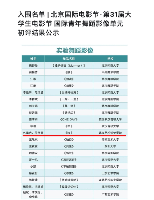 本届国际青年舞蹈影像单元收到上百部作品,分别有10部舞蹈VLOG、20部实验舞蹈影像、4部舞蹈电影与纪实影像、17部舞蹈摄影入围最终评审,我院作品《渡》是其中一部。
