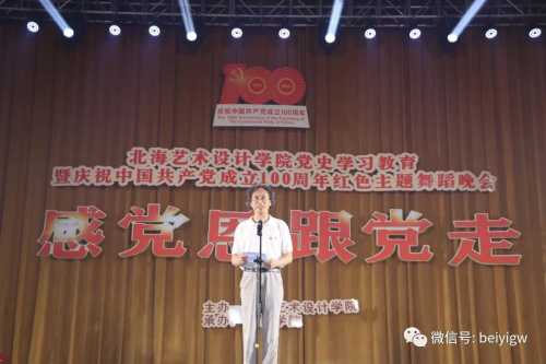 校长卢新华为本次晚会致辞,他指出:在学校党委领导下,我校推出“八展三演”,以优异的教学成果向党汇报,庆祝中国共产党百年华诞。“感党恩跟党走”党史学习教育暨庆祝中国共产党成立100周年红色主题舞蹈晚会,不仅展示了我校师生的教学成果,还将进一步激发我校师生的学史知史爱党爱国情怀,营造我校健康向上、团结奋进的氛围。全校师生以实现北海艺术设计学院第二个20年的发展目标——创办西部一流艺术设计学院和建成民办高校党建典范而努力奋斗。