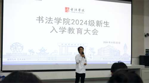 2024年9月22日晚7:30,书法学院举行2024级新生入学教育大会,书法学院院长黎东明、常务副院长苏乃从、党支部书记喻广林出席大会。各行政职能部门领导老师、全体班主任以及2024级全体新生,共计近300人参加会议。会议由常务副院长苏乃从主持。