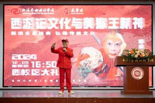 2024年12月5日,一级演员、中国著名表演艺术家六小龄童——章金莱老师受邀来到北海艺术设计学院,为全校师生带来主题为《〈西游记〉文化与美猴王精神》的精彩讲座。本次讲座由文学院主办,常务副院长梁镨文主持。