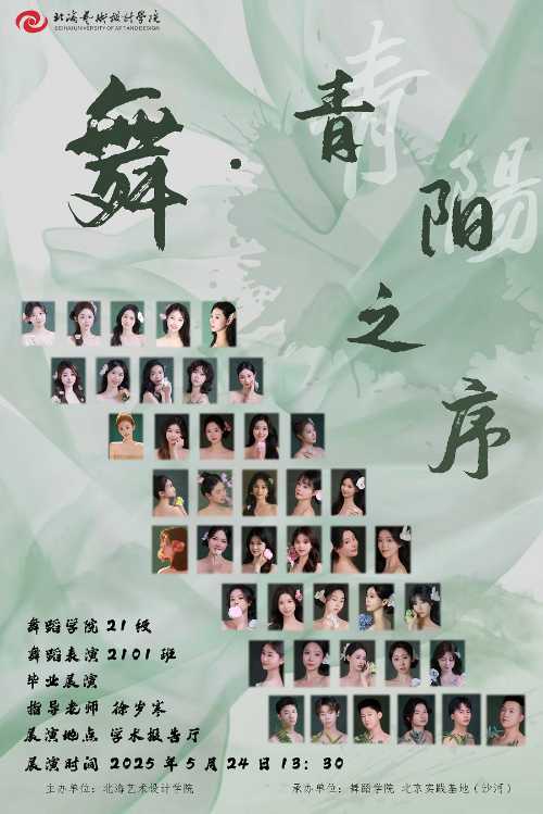 2025年5月23日-5月24日,北海艺术设计学院舞蹈学院舞蹈表演专业2025届毕业生将以最动人的舞姿,上交他们的大学本科四年的青春答卷。本次毕业展演共五场,涵盖古典舞、民族舞、现代舞等多元风格,既有传统的深厚底蕴,又有创新的时代表达,展现学生四年专业学习的成长与蜕变。