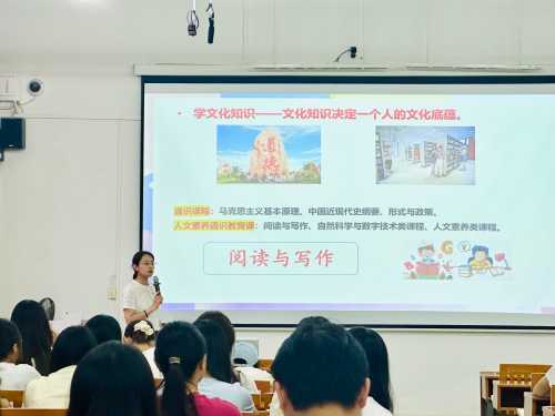 随后,教学副院长蔡森为专升本新生系统讲解学业规划与大学学习要点。蔡森副院长围绕“认识大学学习”展开详细分享。首先强调大学学习的首要任务是践行社会主义核心价值观,叮嘱新生要扣好人生“第一粒扣子”;其二,重点解读人才培养方案,介绍了通识课程与人文素养课程的设置逻辑,提及《阅读与写作》课程对提升综合表达能力、逻辑思维能力的关键作用,同时明确汉语言文学专业的阅读要求;其三,提出专业的学习建议,鼓励新生尝试跨专业学习、主动考取职业证书等,希望新生能借助这些课程实现“文”“艺”兼修,提升综合竞争力。