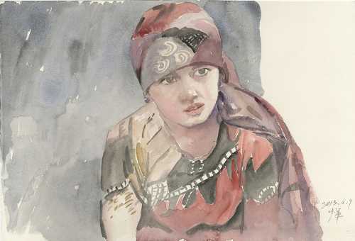 《卖馕的维吾尔族女孩》·55.5x37.7cm·水彩·2013年