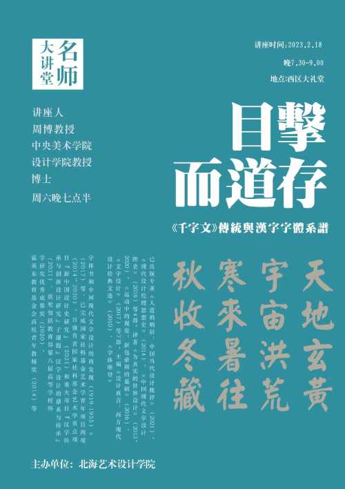 2023年2月18日晚7:30,中央美术学院周博教授于北海艺术设计学院西校区大礼堂,为美术学院师生开展题为《目击而道存:<千字文>传统与汉字字体系谱》的专题讲座。