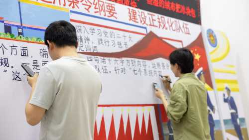 美术学院师生团队以深入学习党的二十大精神、习近平总书记重要训词精神以及“四句话十六方针”为主要内容,精心规划板报整体设计,师生团队分工合作精心绘制,充分发挥专业的优势做好此次社会服务活动。