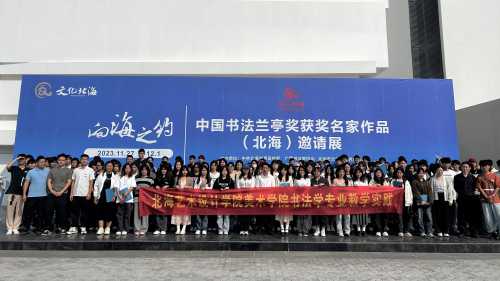 2023年11月27日上午,美术学院书法学教研室由苏乃从主任带领、专业教师组织书法学2022级、2023级学生前往北海爱马思美术馆参观“向海之约”——中国书法兰亭奖获奖名家作品邀请展。