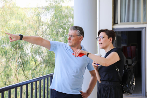 今日,匈牙利佩奇大学工业系主任、副教授、博士生导师Norbert教授,以及工程与信息技术学院建筑视觉系副教授、博士生导师Erika教授,在我校董事长郑念贻先生以及动画与传媒学院杜博副院长、李宗毅副院长等学院领导与老师的陪同下,对动画与传媒学院进行了深入的参观与交流。