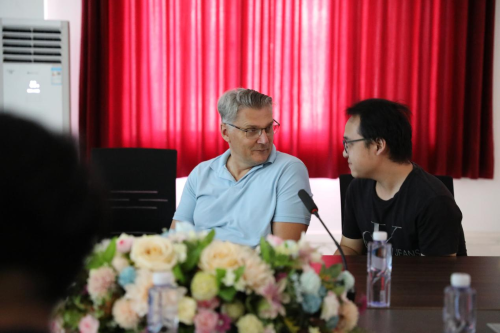 参观结束后,双方在动画与传媒学院综合楼前合影留念。Norbert教授表示,此次访问让他对我校动画与传媒学院有了更深入的了解,也让他看到了两校在动画与数字媒体教育领域合作的巨大潜力。他期待未来能够有更多的合作,促进跨文化交流。