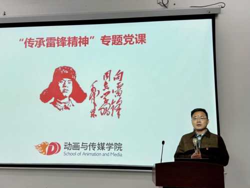 在活动仪式上,学院党总支书记张帆以《传承雷锋精神》为题,向在场师生进行了一场专题党课。他从雷锋精神的时代内涵出发,深刻阐述了新时代青年的使命担当与奋斗青春的重要性。他强调,雷锋精神是一座永不褪色的丰碑,激励着一代又一代青年人为国家、为人民贡献自己的力量。希望动画与传媒学院的师生能够以雷锋为榜样,将雷锋精神内化于心、外化于行,用行动来赓续红色血脉,点燃青春之火,争做为人民服务的实践者。