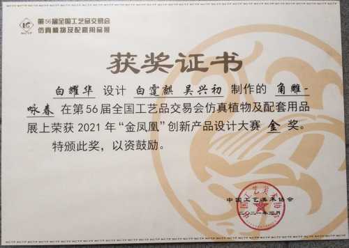 在实践指导方面,白耀华教授带领学生深入角雕创作一线,从选料、设计到雕刻,每一个环节都耐心指导,帮助学生掌握角雕技艺的精髓。他还积极参与指导青年教师,分享自己多年的创作经验与艺术理念,提升教师的教学与实践能力,助力学校打造高水平的师资队伍。在他的指导下,许多学生在各类艺术活动与比赛中崭露头角,为学校争得了荣誉,也为合浦角雕技艺的传承培养了新生力量。同时,通过与学校的合作,合浦角雕这一非遗文化在校园内得到广泛传播,丰富了校园文化内涵,促进了传统文化与现代教育的融合。此外,白耀华还获得了众多荣誉称号。2018年6月9日,他被评为“中国工艺美术大师”;2020年12月29日,荣获“广西工匠”称号;2021年8月,荣获广西五一劳动奖章。2021年,他设计、白霆麒和吴兴初制作的角雕《咏春》在第56届全国工艺品交易会仿真植物及配套用品展上荣获“金凤凰”创新产品设计大赛金奖;2023年5月,他设计的合浦金蝠《九州同庆》荣获2023年“百花杯”评审活动银奖;2024年5月,作品《祥和九州》在第四届“百鹤杯”工艺美术设计创新大赛中荣获百鹤新锐奖。