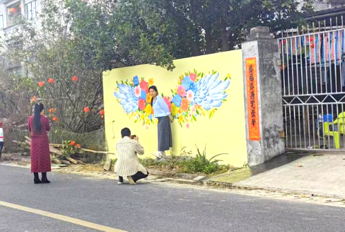 山村小洱海墙绘作品游客打卡照