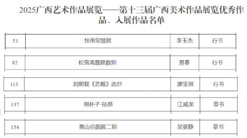 广西艺术作品展览由广西壮族自治区人民政府主办,是全区最高水平的艺术作品展览。在2025广西艺术作品展览——第十三届广西书法(篆刻)作品展览中,书法学院教师李玉杰、易春、廖宝祺、江威龙,2023级学生吴雯静作品入展。