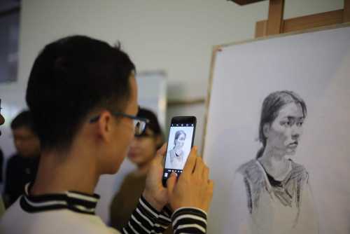 随后,计宇教授开始范画演示,他先把感觉上的大轮廓画出来,而后找具体的关系。并表示绘画的过程是一个修复的过程,要逐步地把它完善。作画中他给同学们细心讲解作画步骤及要领,从结构方面着手深入刻画,逐步使画面更加完整。在模特休息的课间,他与同学们亲切交谈,并倡导要把实践与理论结合起来。