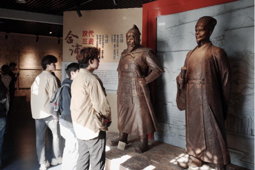 在考察过程中,同学们被馆内陈列的汉代文物深深吸引。在讲解员的带领下,学生们深入了解了汉代的青铜器、服装配饰以及建筑结构,近距离观察到具有代表性的馆藏精品--西汉羽纹铜凤灯。他们仔细观察了文物的造型,纹饰和工艺细节,用心感受汉代的审美追求,每一件展品都仿佛是一位穿越时空的讲述者,向同学们诉说着汉代的辉煌与绚烂。
