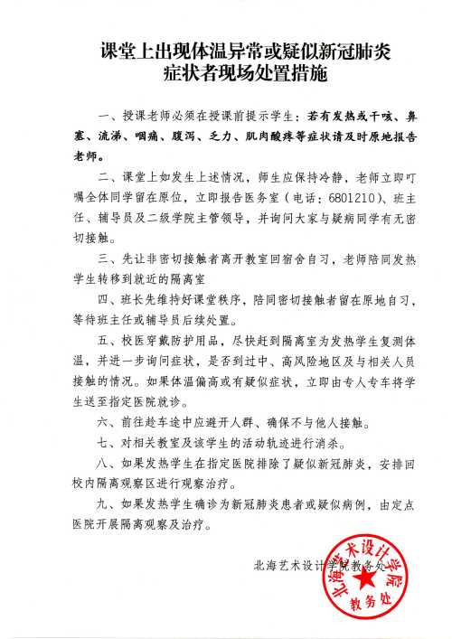 北海艺术设计学院课堂上出现体温异常或疑似新冠肺炎症状者现场处置措施