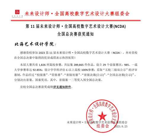 我院师生在2023第11届未来设计师·全国高校数字艺术设计大赛(NCDA)中取得优异成绩!共荣获全国赛区一等奖2项、二等奖4项、三等奖5项;广西区赛一等奖17项、二等奖20项、三等奖28项,学校荣获“省级优秀组织单位”奖。