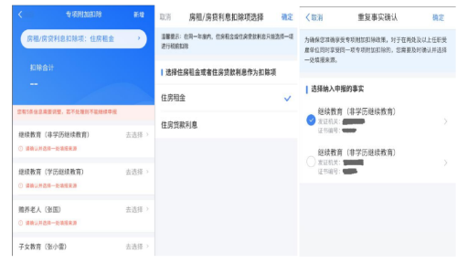 若同一专项附加扣除有重复事实或同时存在住房租金 和住房贷款利息,则系统界面上将出现提示。此时,您需要对相关信息进行确认。