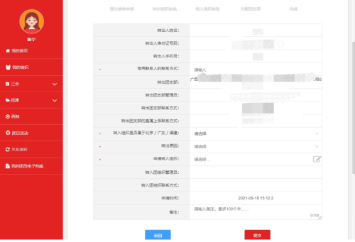4.按照界面要求和提示填写完成后,检查确认信息是否填写无误,点击“提交”,等待转出组织与转入组织审核同意就完成咯~