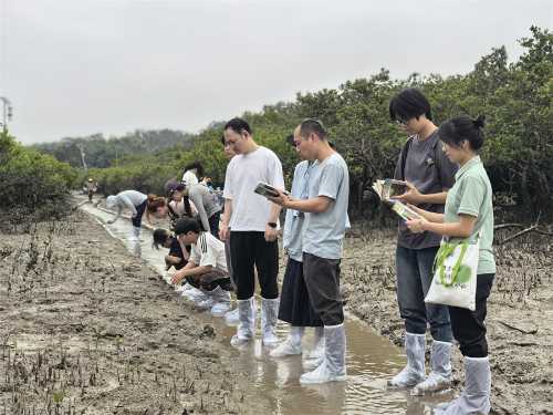 山口红树林保护区作为南方沿海面积最大的红树林生态系统,拥有8000公顷的“海洋绿肺”。退潮后的滩涂上,盘根错节的“呼吸根”构成天然迷宫,招潮蟹列队“巡防”,弹涂鱼泥潭“起舞”,白鹭掠过波光粼粼的水面,构成生动的生态教育场。动画与传媒学院师生深入保护区核心区域,实地观察红海榄、木榄多种珍稀红树植物构成的生态奇观。