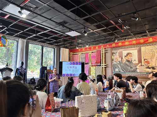 在非遗壮锦工坊,中国工艺美术大师、国家级非遗壮锦代表性传承人谭湘光为考察师生授课,开展了一堂生动的壮锦文化课。谭湘光大师从壮锦的起源讲述了延续千年的技艺如何承载壮族人民的生活智慧与审美追求。她结合实物分享了如何将传统壮锦元素融入现代时装、家居设计,让古老技艺焕发新生。在实践环节,谭湘光大师现场教学,指导学生亲手制作壮锦挂件,体验“寸锦寸金”的工艺魅力,让传统技艺变得可触可感。