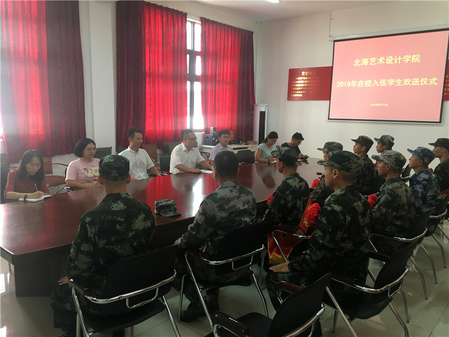 9月12日下午,我校举行2019年在校入伍学生欢送仪式。学校校长助理张帆,学工部部长刘承初,学工处处长王明森,学工处副处长刘玲花、班媚,服装学院副院长唐道明以及14名应征入伍新兵出席仪式。仪式由学校学工处处长王明森主持。
