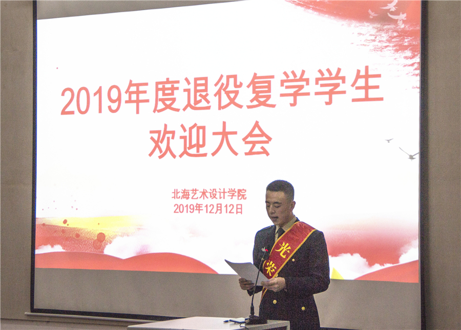 12月12日下午,我校举行2019年度退役复学学生欢迎大会。学校党委书记李高南、学校党委副书记副校长彭仁、学工处处长王明森、学工处副处长班媚、设计学院副院长庞定坤、环艺学院副院长岳莹、环艺学院副院长唐道明、人文艺术学院副院长邓欢、美术学院副院长王习银,以及40名2019年退役复学学生、部分学生代表出席会议。会议由学校学工处副处长刘玲花主持。