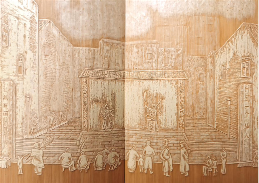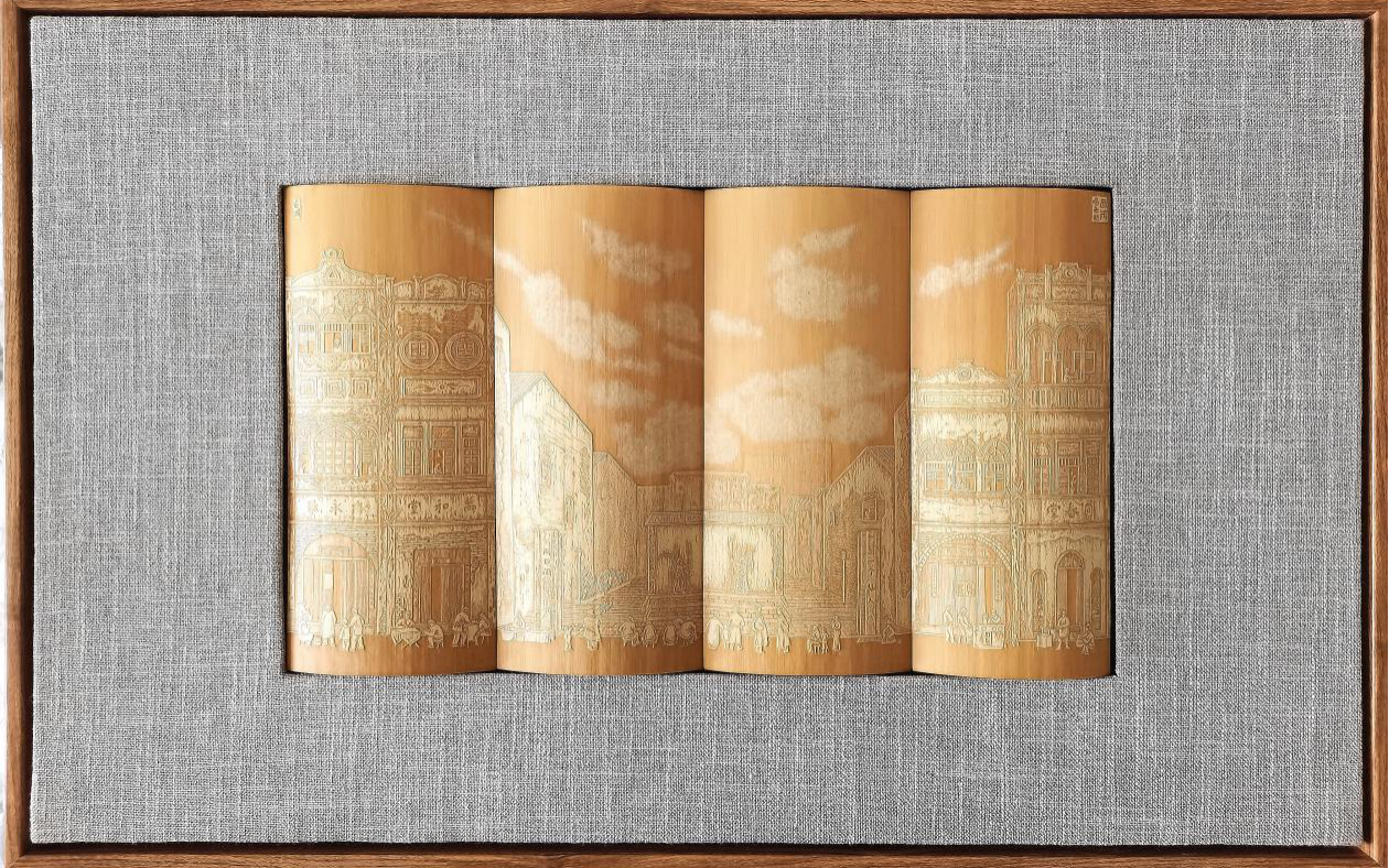 作品“竹刻雕——风雨唱老街”采用毛竹加工后打磨雕刻而成,外层留青竹皮。作品创意来源于广西北海百年老街的落日下的场景,老街的骑楼建筑长卷抒写了一部北海的历史。天空中韵有风雨,中央印有戏子入画,台下伴有市集人常,天地人的融合寓意着不忘历史,唱响未来的美好希冀。