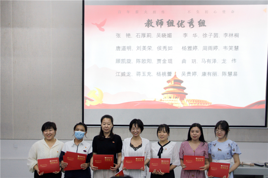 (环境艺术学院第一支部书记顾凯旋、环境艺术学院第二支部书记聂明丽与优秀组教师合影)